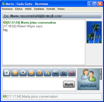 aMSN, podobnie jak Windows Live Messenger, pozwala komunikować się z użytkownikami usługi Windows Live za pomocą wszystkich dostępnych kanałów. O ile przesyłanie komunikatów tekstowych działa dobrze, to wideokonferencje sprawiają pewien problem. W naszych testach nie udało się dojść od czego zależy powodzenie połączenia wideo. Raz działa dobrze, a raz okazuje się niemożliwe do zrealizowania.
